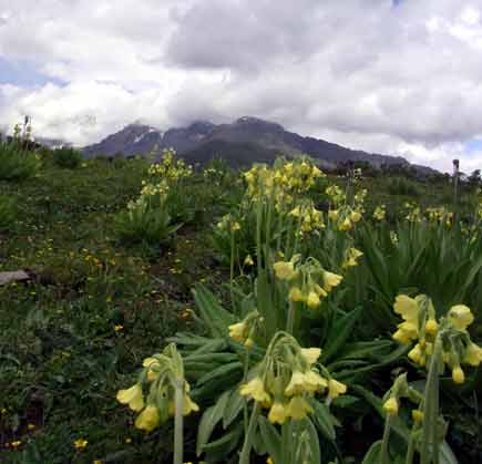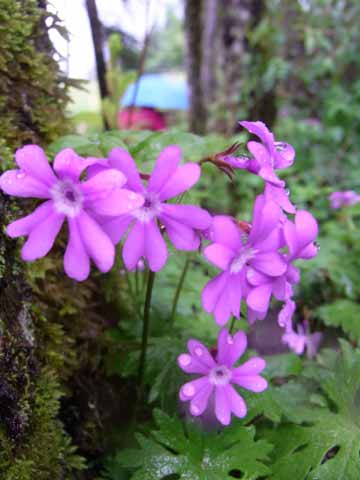 サクラソウ、シオガマ、キンバイソウ、一面のお花がしっとり露に濡れ、花色の風がいたずらに花を揺らせています。