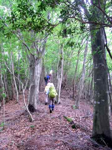 グリーンシャワーいっぱい浴びてルンルン気分♪♪♪ と、気の緩みか次のピーク奥船山を過ぎてあろうことか我が班は一つ尾根を間違えて下りかけました。テープもあり境界杭もあり、それに何と言ってもこの時のトップは超ベテランと言う事もあり、私は何度もこのコースを歩き間違ったこともないので何も考えないでついつい安易に後からついて歩いていました。
