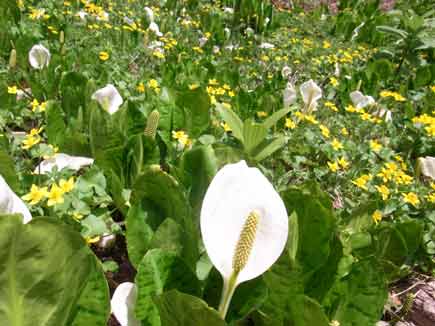 ミズバショウとリュウキンカのコラボはパワー全開、目を見張る明るさ、はじける白と黄色が目に飛び込んできます。