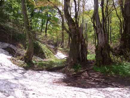 アイゼンはいりませんが雪解けのぬかるみになっていて、渡渉時にかなり雪が残っているところもありました。