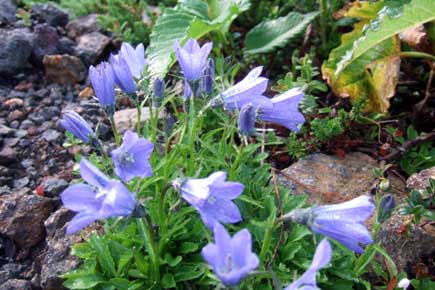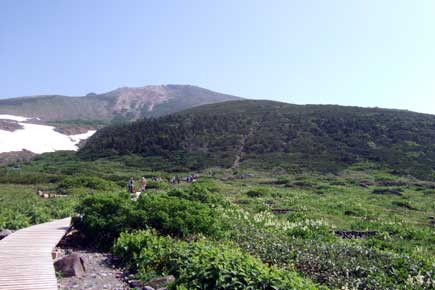 階段状の道は天上界への花道です。天上界と地上界の境界、高天原を通り、色とりどりのお花が朝一番のお顔で迎えてくれます。イワギキョウの紫、ハクサンボウフウの清楚な白がとても涼しげです。