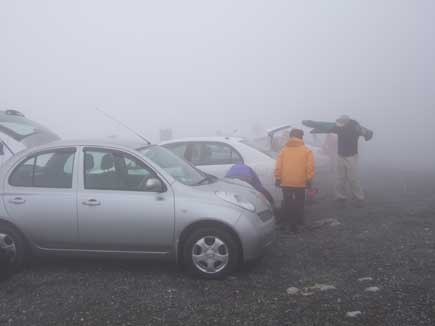 駐車予定の静馬ヶ原(山頂手前)はそろそろかな?という辺りで真っ白のガスに突入します。ライトをつけてもほとんど見えず、対向車のないことを願いつつゆっくり進みますが、見つけられず山頂駐車場まで行ってしまいます。Uターンして更にゆっくり走りやっと、ここだ!と駐車します。先客1台(それさえ最初は見えなかった)あり。