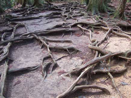 木の根道と鬱蒼とした古木の大杉権現社。岩盤が固く根を張れない杉の根が押し寄せるような不思議な模様を描いています。樹齢は約千年とか、のしかかるような大木、その根には計り知れないエネルギー、パワーを感じます。