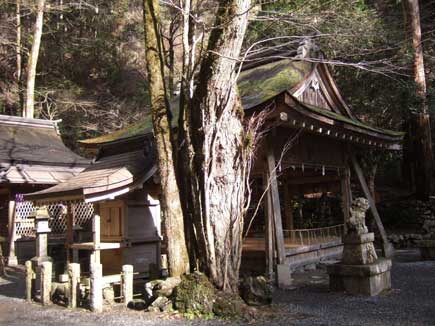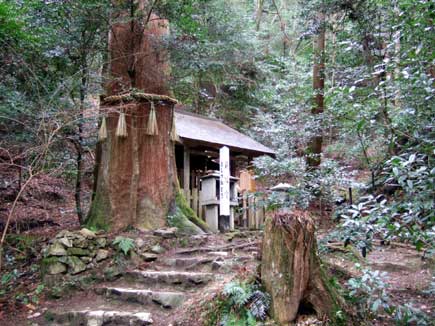 奥宮はさらに、さらに、静寂の空間、しんと張り詰めた空気が漂い古木と清流の聖域です。朱塗りの楼門、本殿、伝説の舟形石などがあります。