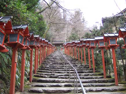 貴船川は鴨川の源流であることから貴船神社は水の神様、縁結びの神様。二の鳥居から赤い灯篭立ち並ぶ石段は幾何学模様の参道です。