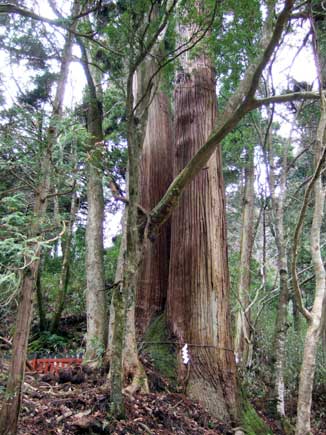 中宮と奥宮の間にある相生の杉。根を同じくする2本の杉で樹齢1000年といわれる大杉です。