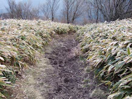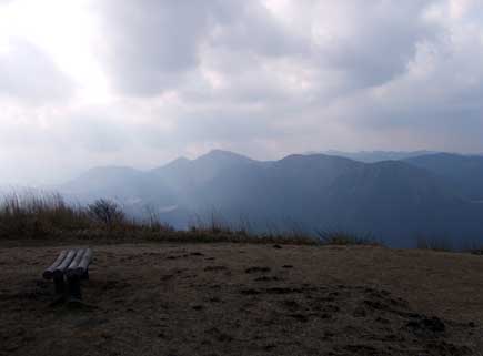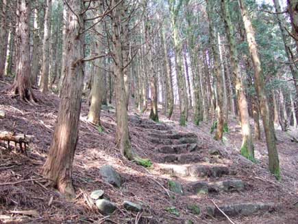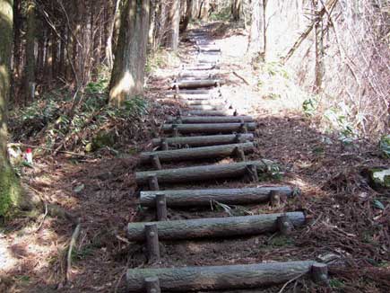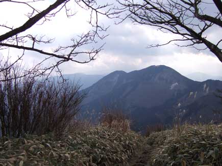 登っても、登っても続く階段、山腹をまく道を左に見て尚階段を上ります。一気に高度をかせぎ振り返ると大洞山の双耳峰がゆったりと見え、階段が終わると笹原です。