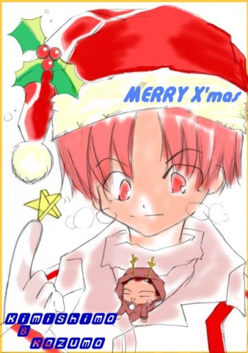Comment:この背景の毒々しい色はないだろう>という声が聞こえてきそうです。いいんです、クリスマスだから(なんだそりゃ)このイラストは実は、知り合いの方がカレンダーを作ると言ったのでそれに参加させていただいたときに描いた絵が元になってます★かなり、あれに比べると色つけが雑ですのぅ・・・まあ、あっちはコピックで描いたんですが★でも実はこの絵気に入ってます★君島が(笑)うぉ、ヒソカに萌え(笑)