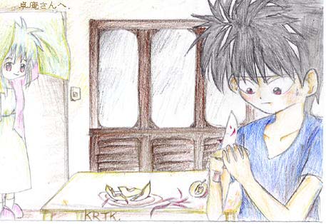 もう閉鎖してしまわれた某超有名サイト様に逆リクで(爆) もらってもらった絵(一目瞭然←消せなくなってたので;;) これもほぼ100%色鉛筆画。飛影の髪と輪郭だけ普通の鉛筆だけど(爆) 大分前に描いた絵だけど掲載はしてなくて、でも今回たまたま見つけて そんなに気に入らん絵ではないので載っけてみました。運だね。 この絵を描くちょっと前に家庭科でりんごの皮むきのテストがありました(^^;)