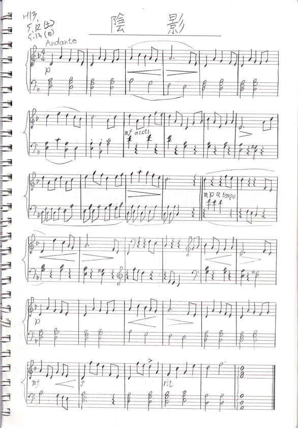 ひっじょうううに読みにくい画像ですいません。(本当にわかりにくいなこれ…) 「レーラーソーファミレーラーソ−」です最初(どう見てもファやん;;) で これはうちが作曲した飛影のイメージ曲です。 古い方の陰影に戻しました。やっぱこっちの方がしっくりくるしね。 四分の四拍子でニ短調です。けっこう暗い曲です。 汚くて読めなかったらカンで読んでリズムとか見て ピアノ弾ける方演奏してくれたらうれしいな♪