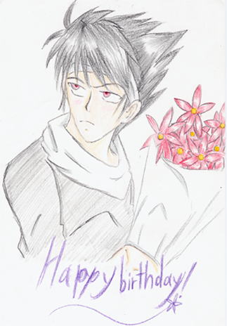 この絵を見た瞬間、興奮して目の前にいたZOROさんをこの絵でバシバシたたきまくってしまったうち…;;(笑) だぁってかっこいいじゃないのよさぁ!なんか大人風味の飛影! 飛影よぅ うち相手に何を照れてんだいvv(アホか) だが花束には抵抗あったりする(^^;)なんか「お花欲しいなーって言ってたろうから」だとか言われた。言ってたけ? なんか丁寧にしてくれたそうでありがとうございます!確かに色鮮やかで綺麗〜! スキャンすんの遅れてごめんね。