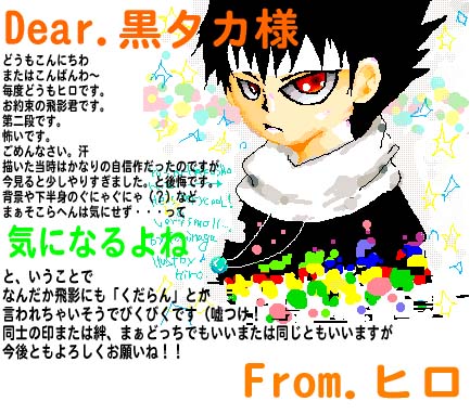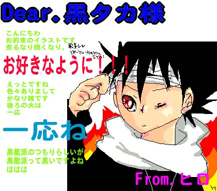 ヒロさんに、「同士の印」として頂いたイラストですvv(^^)(飛影一目惚れ同士の)
