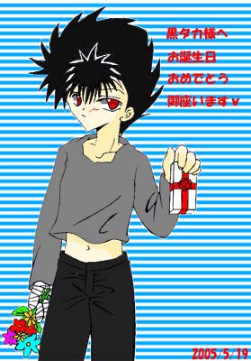 アップが随分遅れてしまってすみませんでしたっ;; 当日に拍手とともに頂いきました飛影です!! この照れ具合とか!服がひらひらして肌の白さとかヘソとか(落ち着け)愛らしいです〜! なんかいろんなものくれるのかしら? お花は生身(ぇ)やけどどっかから摘んできてくれたのかしら?何気なく色鮮やかなイラストですよねvv 今年の誕生日は結構ボロクソだったので…;;元気でたです。。覚えてくださってありがとうございました!!