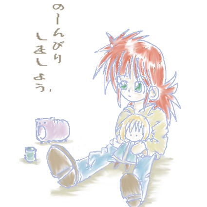 「○○と××描いて〜」などの抽象的な依頼だと、なぜか変な絵を描いてしまうのがうちの特徴(^^;) 「蔵馬がクラピカのぬいぐるみ持ってる絵」です。 描き文字わけわかんね〜(汗)お茶の宣伝みたいだな。 ちょいと水彩画風にしてみました☆蔵馬の髪の毛とかズボンとかね。 蔵馬の髪の毛…。血の色じゃん(オイ) ぶたの蚊取り線香入れがどーしても変になっちゃったのが心残りです。