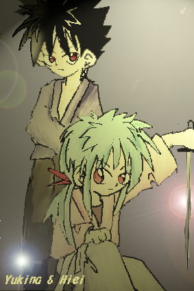 この絵どうなってるのか、背景暗いとわかりにくいな〜〜。 二人とも着物(忍者のかっこ)着てるの。あるゲームキャラの影響で(^^;)。 なんとなく雪菜ちゃんメイン☆目でっかい。妙に鮮やか。 第二次雪菜特訓しようかな…。可愛い雪菜ちゃんが描けないではないか 暗い背景に暗い絵は合わないということが分かりました…。 勇ましい雪菜ちゃんがちょっと描きたかったのです。 後ろにいる飛影は雪菜の師匠。かっこつけ☆