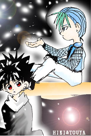 1週間以内ってかいてたのに(微妙に)遅れてごめんなさい;; 都合上他のみなさんへのキリリクも同時にアップしたかったので。 え〜〜と まとも凍矢くん描くのははじめてですね。(女装凍矢なら描いたこと在ったんだけど;;汗) これ…凍矢くんが雪降らせて飛影が「オヤ雪だ」ってゆってるような絵…のつもりです。 二人とも氷系?雪?には因縁あるひとですからね。 飛影なんでこんなにくり目になったのかは謎です(^^;) そして凍矢もっと修業すべし!(すみませぬこんな絵で許してください;;)